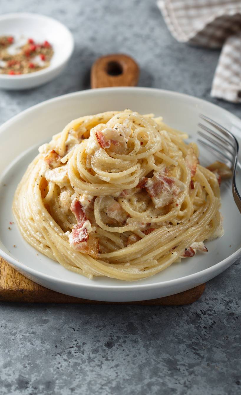 Menu con Pasta italiana con salsa cremosa de huevo y queso parmesano, panceta crujiente y pimienta negra recién molida. + sopa del dia + refresco + cafe